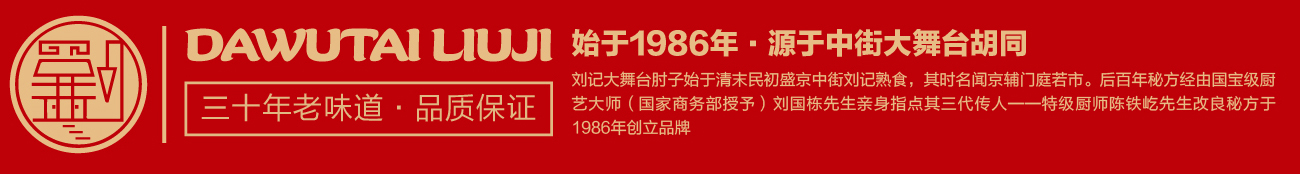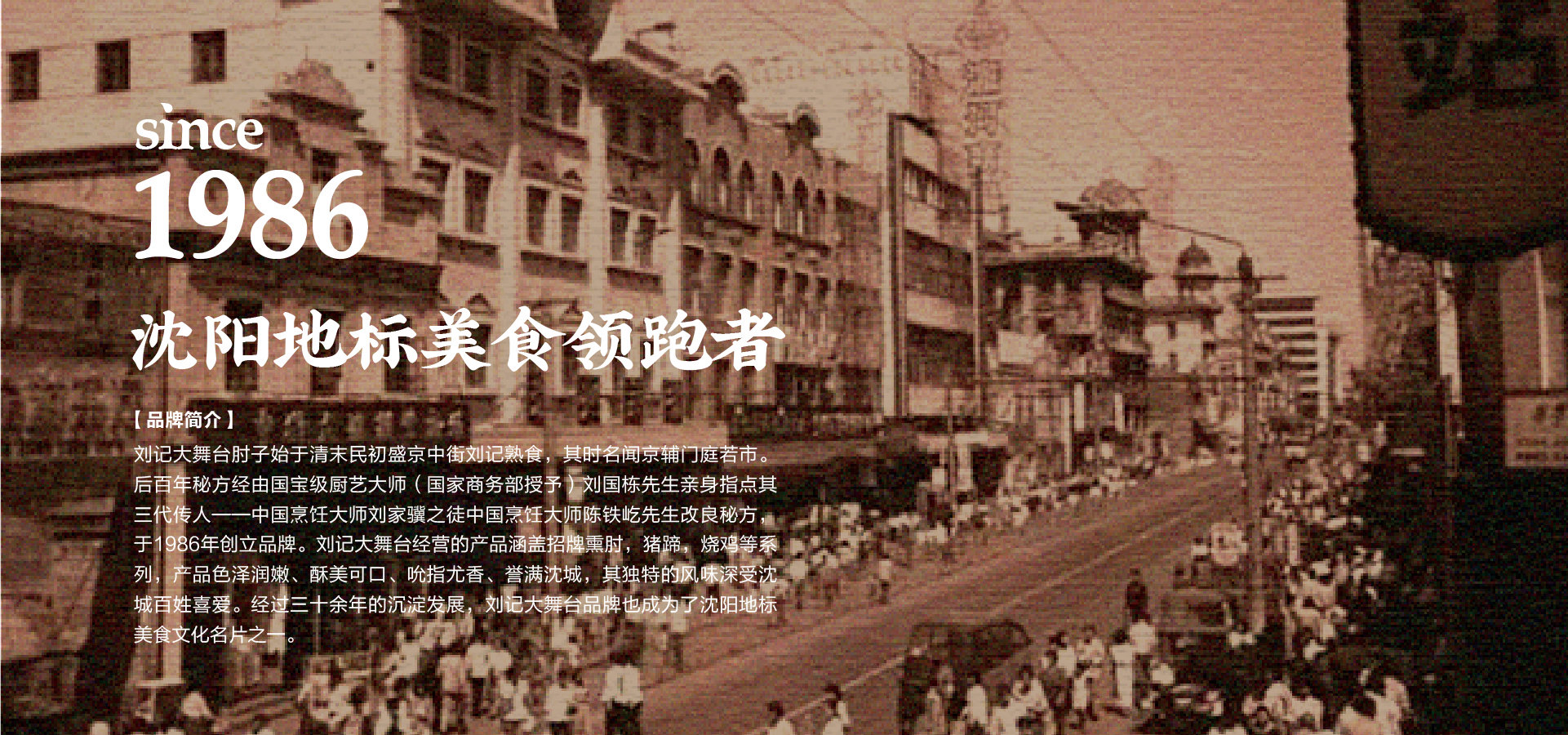 盛京,昔乃大清王朝發(fā)祥之地。劉記大舞臺(tái)肘子始于清末民初盛京中街劉記熟食,其時(shí)名聞京輔門庭若市。后百年秘方經(jīng)由國(guó)寶級(jí)廚藝大師(國(guó)家商務(wù)部授予)劉國(guó)棟先生親身指點(diǎn)其三代傳人——中國(guó)烹飪大師劉家驥之徒中國(guó)烹飪大師陳鐵屹先生改良秘方,于1986年創(chuàng)立品牌。劉記大舞臺(tái)經(jīng)營(yíng)的產(chǎn)品涵蓋招牌熏肘,豬蹄,燒雞等系列,產(chǎn)品色澤潤(rùn)嫩、酥美可口、吮指尤香、譽(yù)滿沈城,遂成古今絕味,其獨(dú)特的風(fēng)味深受沈城百姓喜愛。經(jīng)過三十余年的沉淀發(fā)展,劉記大舞臺(tái)品牌也成為了沈陽(yáng)地標(biāo)美食文化名片之一。